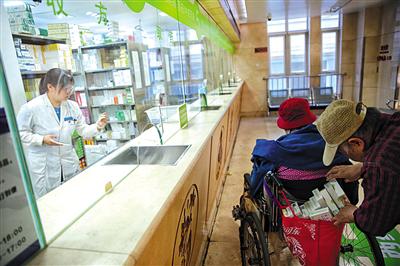 5月11日,中醫藥學院第三附屬醫院,兩位老人在取藥處取藥,他們這次取了將近30盒藥。新京報記者彭子洋攝
