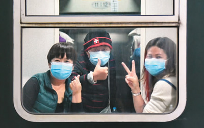 圖為10月29日,滯留游客離開內蒙古額濟納旗時,在列車車廂里與地面人員告別。