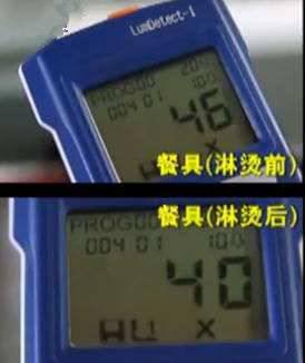 首先,用100℃開水對餐具進(jìn)行淋燙,再對細(xì)菌數(shù)值(RLU,相對光單位)進(jìn)行檢測。其次,測試儀結(jié)果顯示具表面細(xì)菌數(shù)值為40RLU。