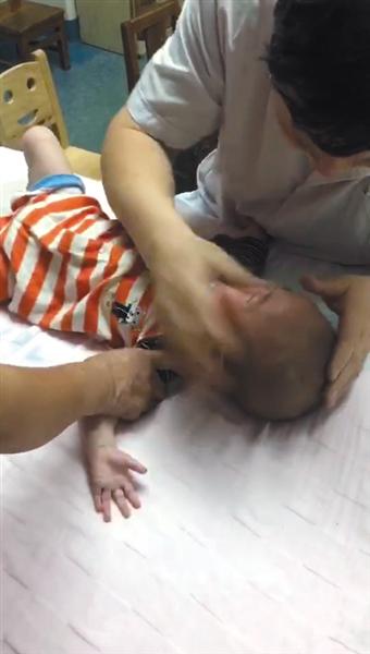 在楊女士提供的另一段視頻中,孩子躺在床上大哭,醫(yī)生揉捏其手指、眼睛、鼻子等部位,并拍打孩子頭部。