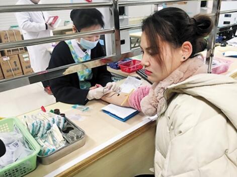 能一口氣喝八瓶啤酒的“女酒神”在醫(yī)院抽血化驗(yàn)。 本報(bào)記者甘俠義攝
