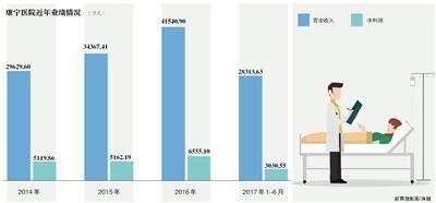 2014年-2015年,康寧醫(yī)院的營(yíng)業(yè)收入分別為29629.60萬(wàn)元、34367.41萬(wàn)元,凈利潤(rùn)分別為5119.86萬(wàn)元、5162.19萬(wàn)元。2016年實(shí)現(xiàn)營(yíng)業(yè)收入約4.15億元,凈利潤(rùn)6555.10萬(wàn)元。今年上半年實(shí)現(xiàn)營(yíng)業(yè)收入約2.83億元,凈利潤(rùn)3030.55萬(wàn)元。