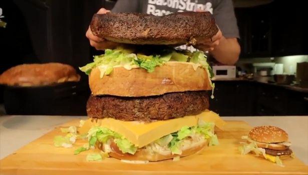 這一巨型漢堡重達100磅(約45公斤),是Nathan Figueroa專為挑戰所精心制作的。觀眾從視頻中看到,Nathan Figueroa坐在餐桌旁,一層一層加料制作巨無霸漢堡,還有他專門做的大號芝麻面包。有眼尖的網友注意到這個特制的巨無霸漢堡中少放了腌黃瓜。網友Mike Shea留言:“漢堡沒有加進腌黃瓜”,另外還有多則評論也提到了這一點。