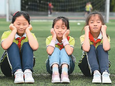 圖為6月6日,貴州省仁懷市實驗小學,小學生在體育課間做眼保健操。