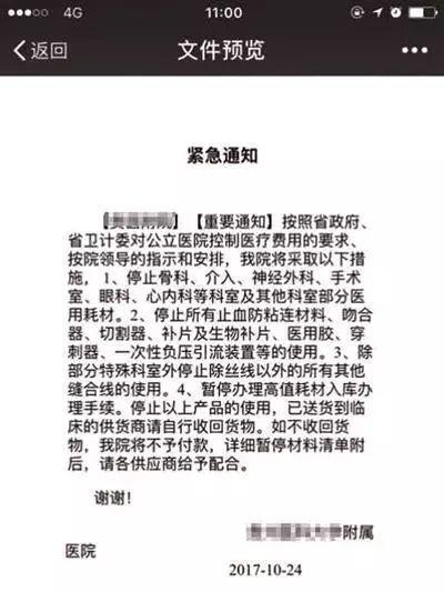 事情的起因是前幾天,落款為貴州省某三甲醫(yī)院的緊急通知被廣泛傳播。從內(nèi)容中可以看出,醫(yī)院將采取停止多個(gè)科室部分醫(yī)用耗材的措施,還將暫停辦理高值耗材入庫手續(xù)。已經(jīng)送貨到臨床的供貨商被要求自行收回貨物。