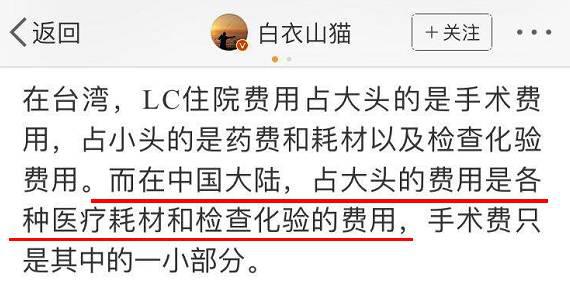 業(yè)內(nèi)人士@白衣山貓發(fā)文稱,他從臺(tái)灣業(yè)內(nèi)人士處得到的信息是,中國大陸的醫(yī)療耗材費(fèi)用所占比例遠(yuǎn)高于臺(tái)灣。