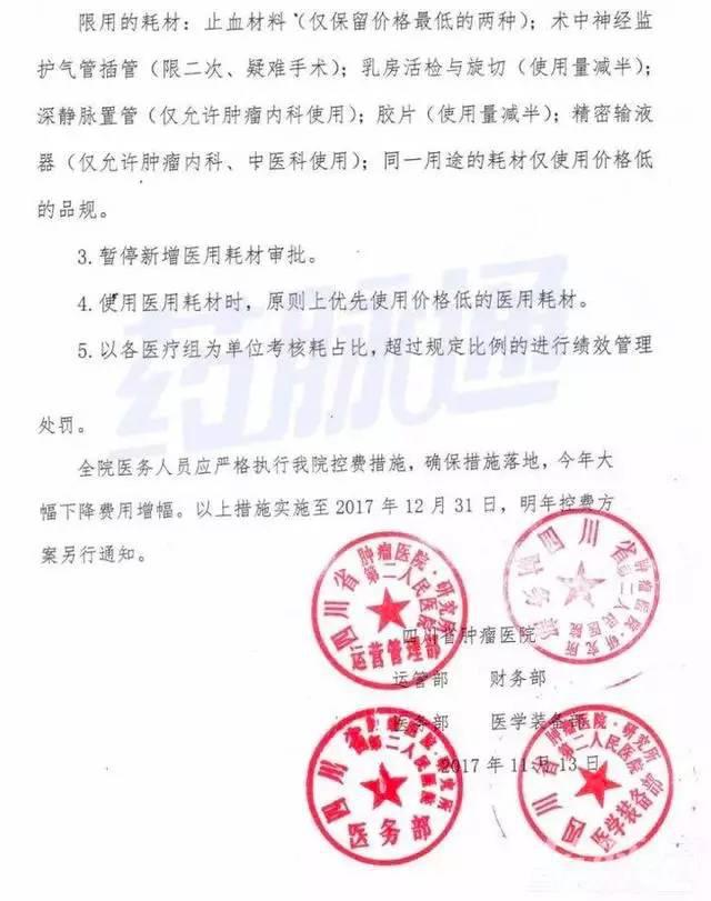 比如四川,有業(yè)內(nèi)人士曝光了11月13日四川省腫瘤醫(yī)院發(fā)布的《關(guān)于醫(yī)療控費(fèi)的通知》,其中同樣提到了根據(jù)不同條件,限制使用多種耗材。