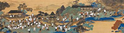 縱覽中國古代繪畫史,不乏表現(xiàn)騎射、馬球、冰嬉等體育題材的美術(shù)作品。如今,一些美術(shù)工作者嘗試從這些作品中汲取營養(yǎng),以傳統(tǒng)中國畫的形式意趣表現(xiàn)當(dāng)代生活圖景,較具代表性的作品有羅小顏、陳煜璧合作的中國畫《晨練》。作品采用傳統(tǒng)青綠山水的設(shè)色與構(gòu)圖,點(diǎn)景人物穿行其中,寧靜典雅,意趣生動(dòng)。畫面以長卷形式展開,湖天平遠(yuǎn),樓閣小橋、一兩扁舟皆對應(yīng)現(xiàn)實(shí)公園的景色。細(xì)看畫中人物,或靜坐垂釣,或歡快起舞,或拂袖揮劍,日常生活中的晨練時(shí)刻得到巧妙再現(xiàn),令人印象深刻。這也啟示著當(dāng)代美術(shù)工作者,傳統(tǒng)中國畫的創(chuàng)作內(nèi)容同樣來源于生活,今日中國畫的創(chuàng)新,既要立足傳統(tǒng),更要深入生活,從題材內(nèi)容、形式語言、創(chuàng)作理念等方面尋求突破。