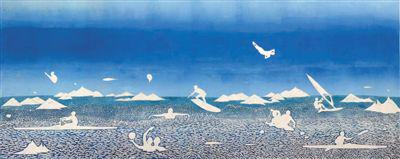 健步走、路跑、廣場舞以及水上運(yùn)動(dòng)等大眾喜愛的健身休閑活動(dòng),或單獨(dú)出現(xiàn)在畫面中,或經(jīng)由組合重構(gòu)的方式得到藝術(shù)化再現(xiàn)。如李長興版畫《同一天空下》,聚焦游泳、沖浪、跳水、帆板、皮劃艇等項(xiàng)目,生動(dòng)展現(xiàn)了水上運(yùn)動(dòng)熱。畫幅被創(chuàng)作者有意地橫向拉長,由此產(chǎn)生一種海闊天高的視覺感受,體現(xiàn)出水上運(yùn)動(dòng)帶給大眾的無限樂趣。李宏鈞中國畫《全民健身 律動(dòng)中國》,則將滑旱冰、練太極、在健身器材上鍛煉等多項(xiàng)活動(dòng)組合于一幅畫面中,展現(xiàn)出群眾多姿多彩的健康生活。