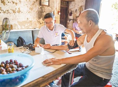 圖為近日,在重慶市巫溪縣田壩鎮田壩村,蔣在強(左)在入戶走訪時為村民做健康監測。