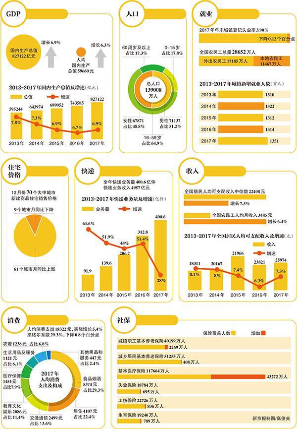 2月28日,國家統計局公布的《2017年國民經濟和社會發展統計公報》,公報顯示,全年國內生產總值827122億元,比上年增長6.9%,GDP增速自2011年首次回升。出生人口方面,2017年出生人口1723萬人,較2016年1786萬人減少63萬。