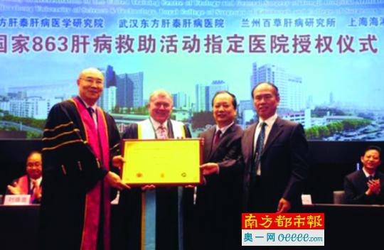 “863肝病救助工程網”上另一張圖片顯示為“863肝病救助活動指定醫院授權儀式”,但圖片中講臺上卻貼有同濟醫院的頭銜,講話的人身穿學士服。南都記者在同濟醫院官方網站上發現,同一張圖片實際上是2011年9月,同濟醫院普通外科、泌尿外科專科醫師培訓中心舉行揭牌儀式。