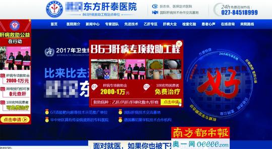 東方肝泰醫院首頁上浮動著幾處炫目的彈窗廣告———“幫女郎·陽光愛心”肝病救助公益行動,聲稱網絡預約可以享受0元查肝、肝病專項救助金2000元-1萬元,100名特困患者可免費治療。