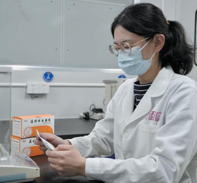 漳州片仔癀藥業股份有限公司工作人員對清肺排毒顆粒進行檢驗。
