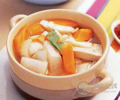 做法很簡單:將大白菜、白蘿卜、胡蘿卜和豆腐洗凈,切成條,用沸水焯一下?lián)瞥龃茫涣砥鹩湾仯聪氵m量辣椒醬后倒入清湯,把白蘿卜、胡蘿卜、豆腐放入鍋中,大火煮開后加入大白菜再次煮開,用鹽調(diào)味,撒上香菜末盛出即可食用。需要注意,白蘿卜富含維生素C,VC最怕氧化,而胡蘿卜含有很高的氧化酶。為了不破壞影響,先將胡蘿卜煮兩分鐘左右,再加入白蘿卜。