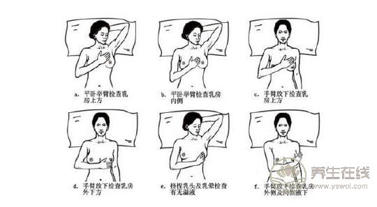 擰:除了乳房,亦須檢查腋下有無淋巴腫大(因為如果有病癥,淋巴結腫大首先就會蔓延至腋窩下)。最后再以大拇指和食指壓擰乳頭,注意有無異常分泌物。