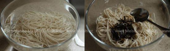 7.面條煮熟后,放入冰水中投涼,撈出,加入兩勺蔥油汁,拌勻開