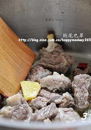 4.加入牛骨頭和適量清水,水量要沒過牛肉。燒開后轉小火,慢燉七八十分鐘(也可以使用高壓鍋,大大節約時間,二三十分鐘即可,我是害怕那玩意噗噗噴氣的樣子,沒敢用)