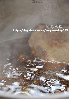 5. 時間到了之后,將牛骨頭撈起,不用。往湯里加2勺老抽,1小勺白糖,適量鹽(鹽不要多,老抽有咸度的)調味,轉大火