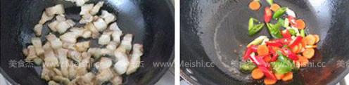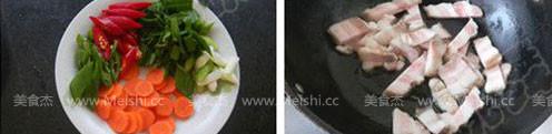 2.煮熟的五花肉切薄片,青紅尖椒切顆粒,青蒜切段,胡蘿卜切細薄片待用,熱鍋小火放入肉片逼出油