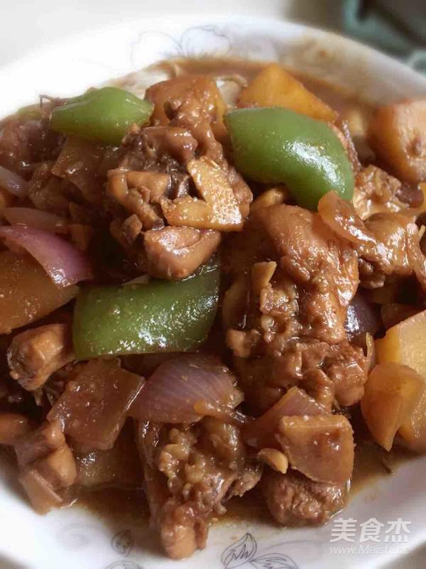 放入彩椒洋蔥 翻炒均勻 蓋鍋蓋大火收汁 出鍋前三分鐘放鹽 味精 十三香 翻炒均勻 出鍋即可