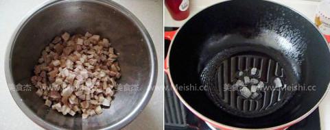 4. 撈出沖干凈浮沫,切成小丁,鍋放植物油,同時放進(jìn)冰糖小火慢慢炒
