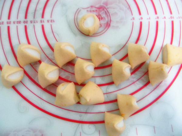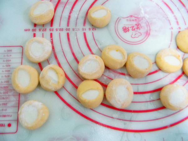 3.用胡蘿卜泥和面,和成軟硬適中的面團,蓋好餳著去做餡