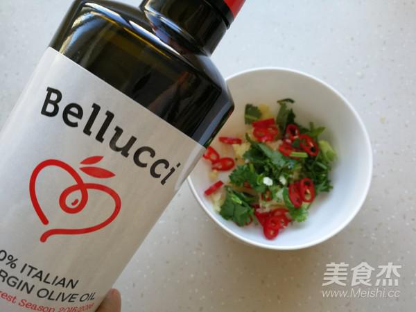 大蒜切末,香菜切小段,紅椒切圈。