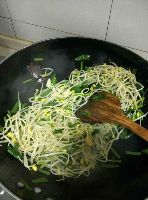 鍋里倒油油熱,先放韭菜,翻炒再放豆芽