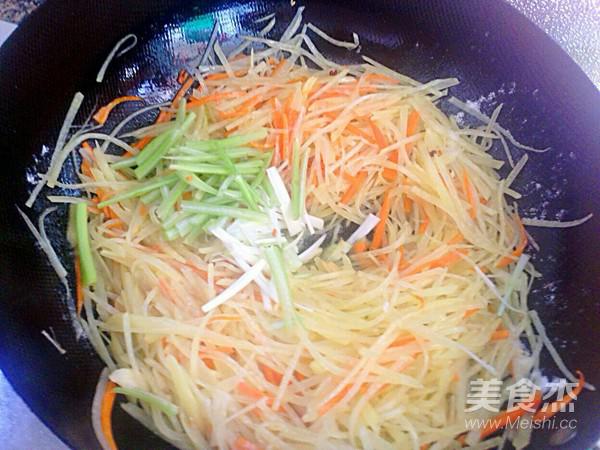 土豆絲泡過后清洗幾遍把淀粉洗干凈炒時不易糊鍋\n炒土豆絲時要用大火快速翻炒