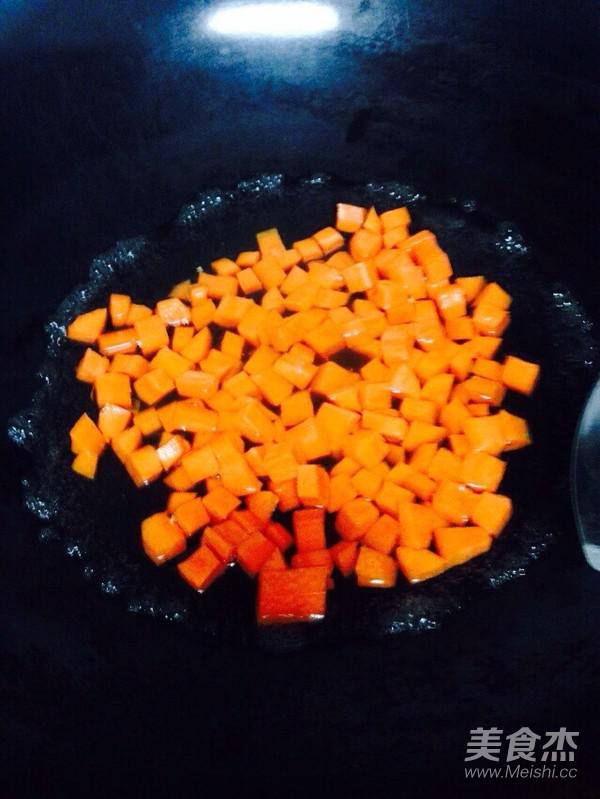 胡蘿卜去皮切丁,鍋里倒入適量的水,放入胡蘿卜焯水撈出瀝干水分備用