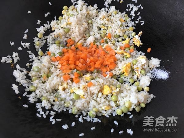 把米飯炒散一些加入煮熟的豌豆一起炒均勻片刻
