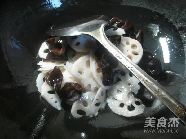 燒鍋倒油燒熱,下入焯好的蓮藕和黑木耳翻炒一下。