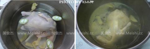 1.三黃雞清理干凈,剁去雞頭、雞爪和雞屁股,蔥姜切片備用