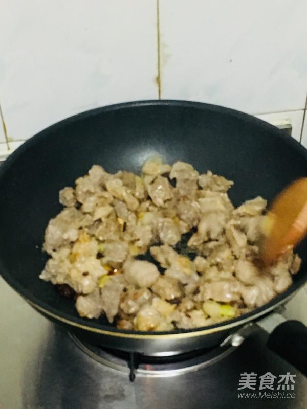 6.翻炒至肉有一點焦黃色。