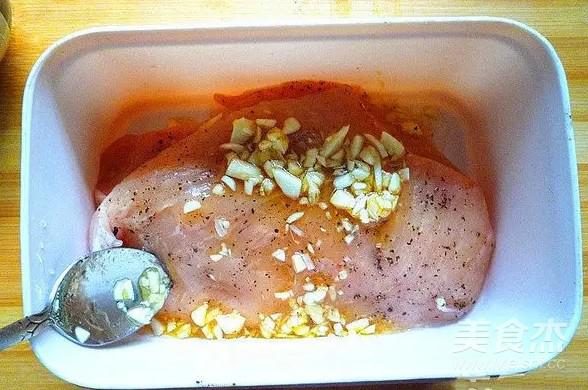 將步驟4的蒜末和蜂蜜混合液與雞胸一起放入保鮮盒中,雙面涂抹均勻后保鮮膜密封,放入冰箱腌制數個小時。