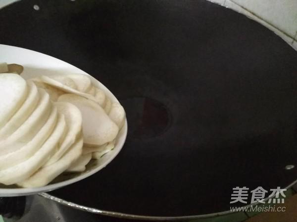 杏鮑菇洗凈、切好,放入熱鍋中,猛火炒