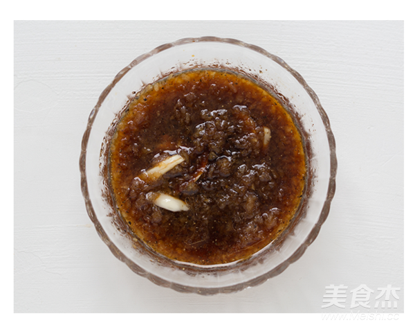 加入醬油、香油、料酒、蠔油,將大蒜切成片與黑胡椒和鹽一起加入梨蓉中,攪拌均勻