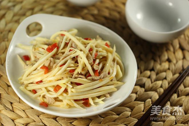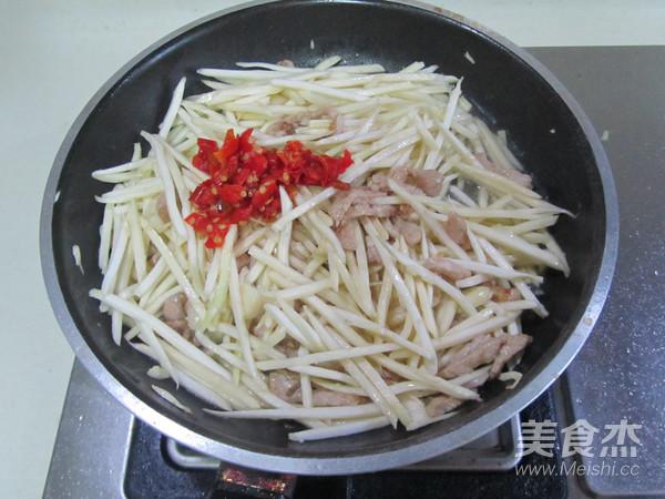 肉絲翻炒變色后加入茭白絲進去翻炒;