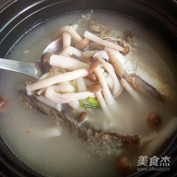 五分鐘過后可以看到鯽魚湯已成奶白色,這時(shí)把準(zhǔn)備好的鮮菇蔥段,放入湯中再煮五分鐘