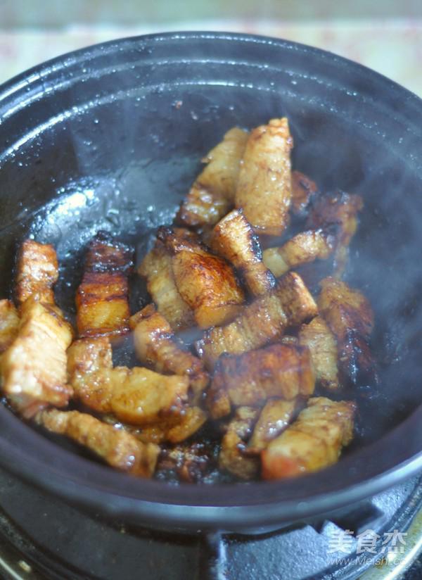 砂鍋里倒入油,放入冰糖,等糖融化后變色放入五花肉翻炒上色。