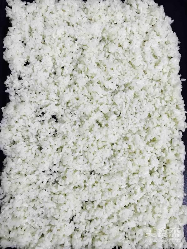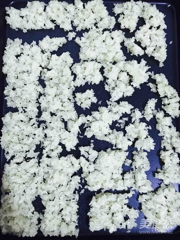 剩米飯鋪在烤盤上,100度,熱風烘焙,至少3小時,烘干。如果你不急著吃的話,不建議用烤箱烘,時間實在是太長了,可以放在竹篩里面,放在太陽下面曬幾天。