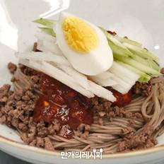將面煮熟后放入碗里,放入準(zhǔn)備好的肉,醬料,黃瓜,梨,雞蛋,完成。