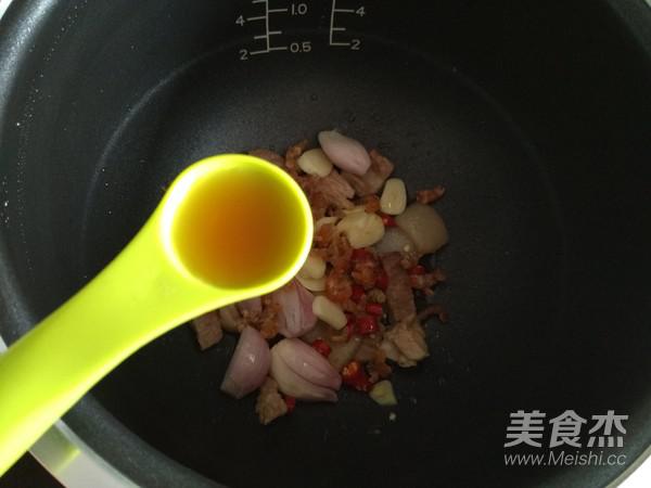 4.內膽加熱之后,打開鍋蓋,放適量食用油,再將豬瘦肉片放入鍋內,翻炒直至變色;