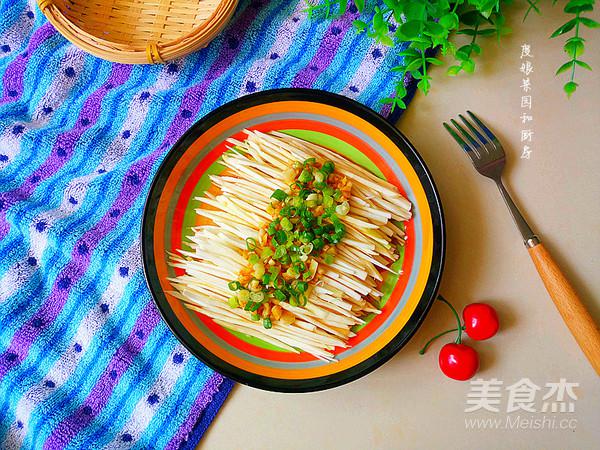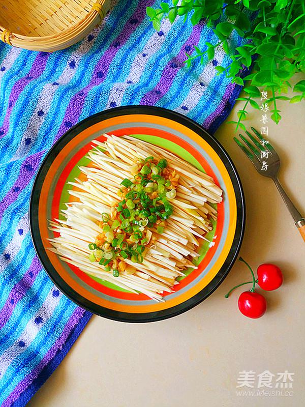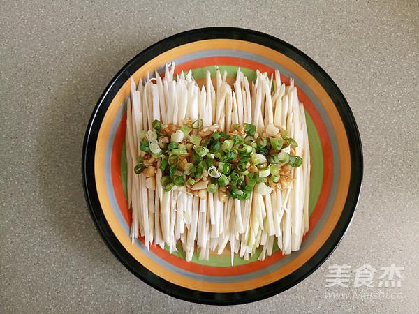 5.將茭白絲放入盤子,倒入調(diào)味料,吃時拌勻,如果不習(xí)慣生吃茭白,也可以將茭白開水焯熟。