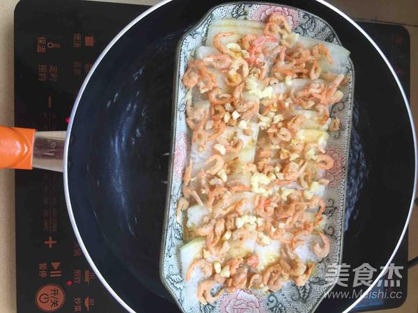 泡好的蝦米撈起來沖洗后均勻地鋪在冬瓜上,蒜泥也放進去