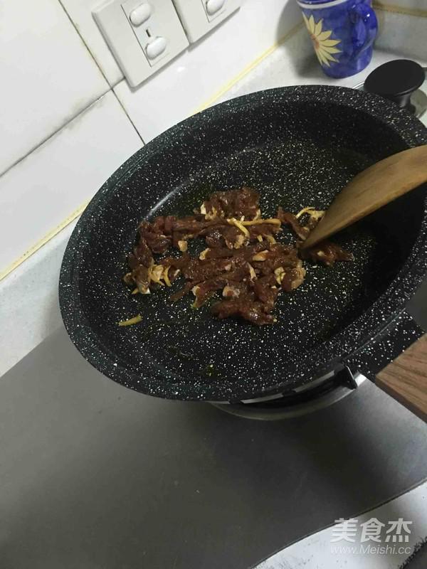 起油鍋倒入腌好的牛肉翻炒一分鐘后加入洋蔥。