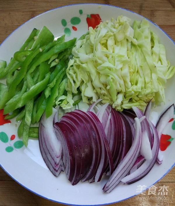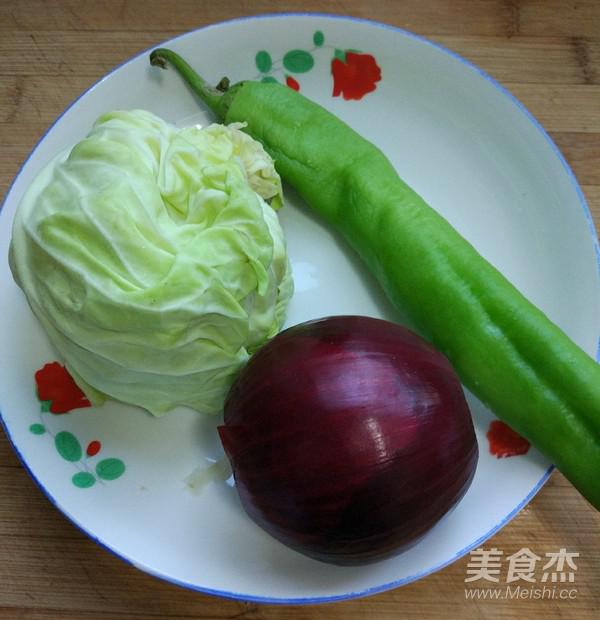 7.下入洋蔥,尖椒,包菜煸炒。邊炒邊烹入味極鮮,老抽增色增香。淋入一點熱水,調入味精,胡椒粉翻炒均勻。