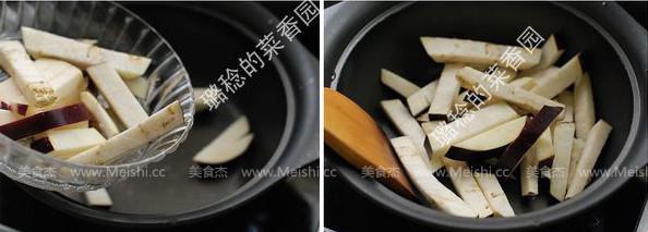 2.鍋?zhàn)訜裏?,先不放油,將茄子條倒入,小火慢慢煸炒