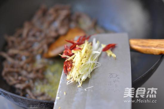 用鍋鏟推動肉絲肉絲比較松散并且有發(fā)硬的感覺,肉絲顏色變成深褐色;這時候倒入干辣椒絲,蔥姜絲炒出香味,這時候燃氣灶保持中火